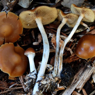 First Photo: Specimens showing the tendency of the stipe bases to bring up large chunks of substrate tightly bound with tough rhizomorphs. Note the aqua to navy-blue stains and the wavy cap margins.